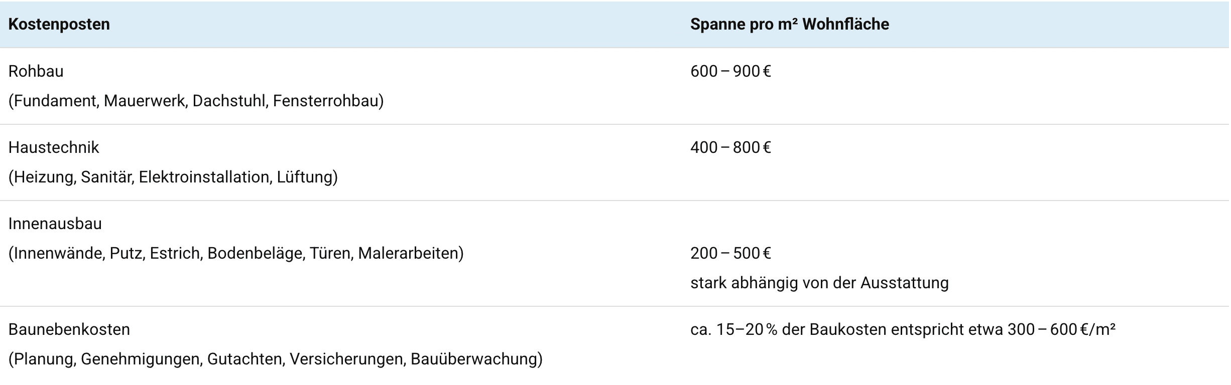 Die folgende Tabelle zeigt grob die typischen Preisbestandteile eines Einfamilienhauses in Massivbauweise und deren Größenordnung pro Quadratmeter Wohnfläche: